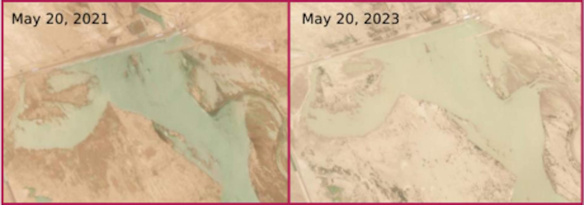 AW analysts obtained satellite imagery of the two dams in May 2021, 2022 and 2023. Comparing the images below, there seems to be more water storage in the Kajaki Dam this year than in 2021.