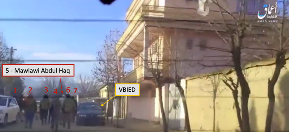 The explosion was claimed via a statement shared by an ISKP-linked Telegram channel on the same day. Amaq news – linked to Islamic State central – later shared a statement and a [WARNING: GRAPHIC] video showing the moment of the explosion. The attack was filmed from a vehicle driving away from the VBIED, which explodes several seconds later as Mawlawi Abdul Haq and six other men walk past the vehicle.