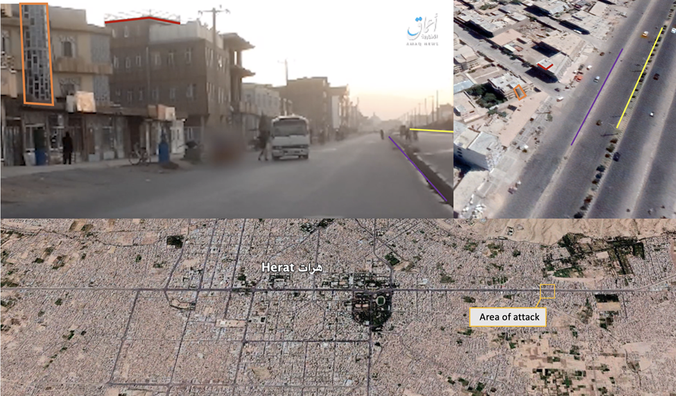 Figure: Geolocation of footage, shared by ISKP telegram channels, showing the moment of the attack on the Taliban-operated bus in the Joye Inji area of Herat [34.349941, 62.242034].