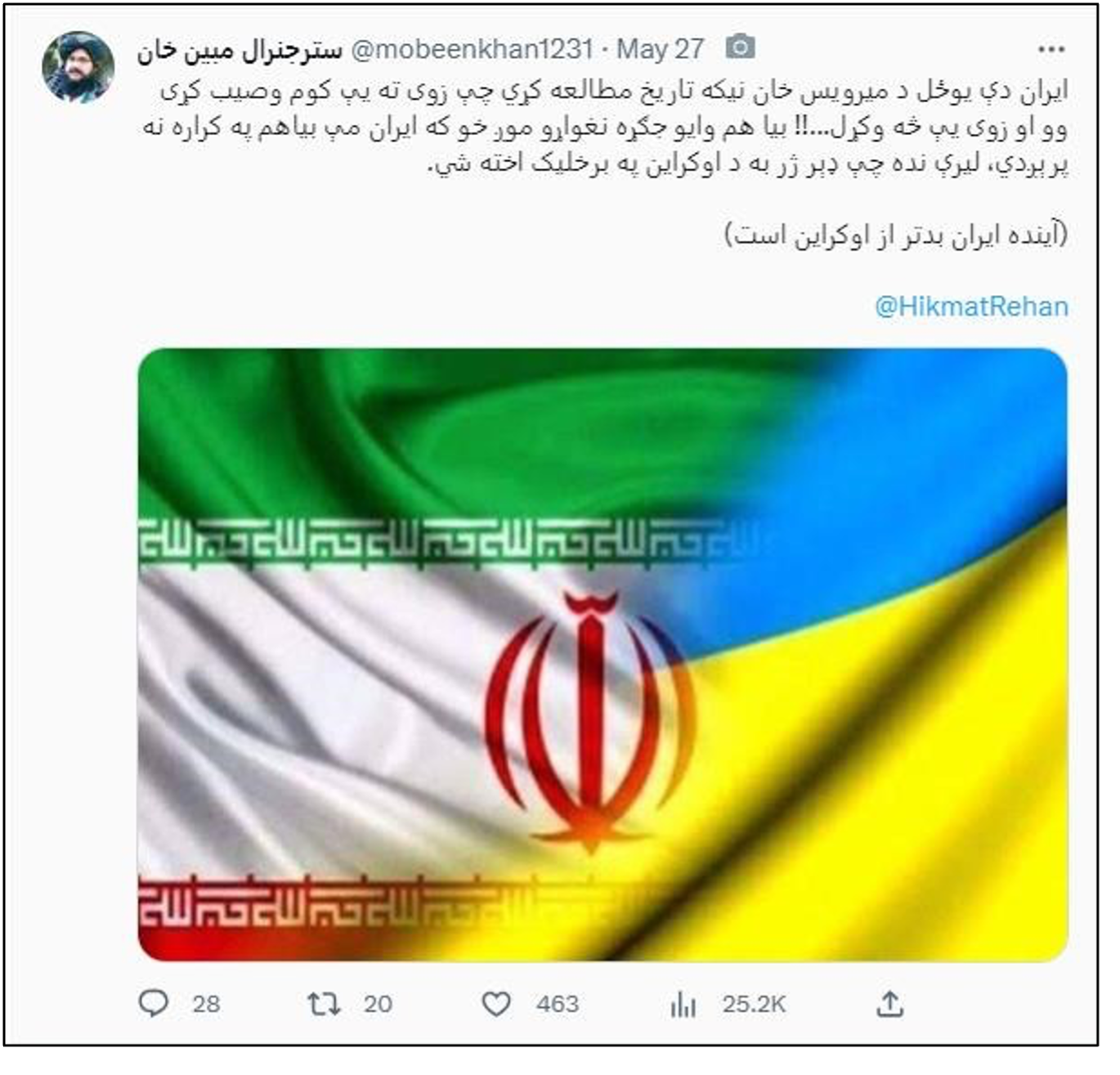 On May 27, Khan tweeted “Our Country’s great heroes, history makers are heroes and holy martyrs. Iran’s evil goals will be thwarted by god.” Khan alleged that Iran was spreading hateful rhetoric about Afghanistan and the Taliban. In the tweet below, Khan compared Iran’s fate to that of Ukraine, stating: