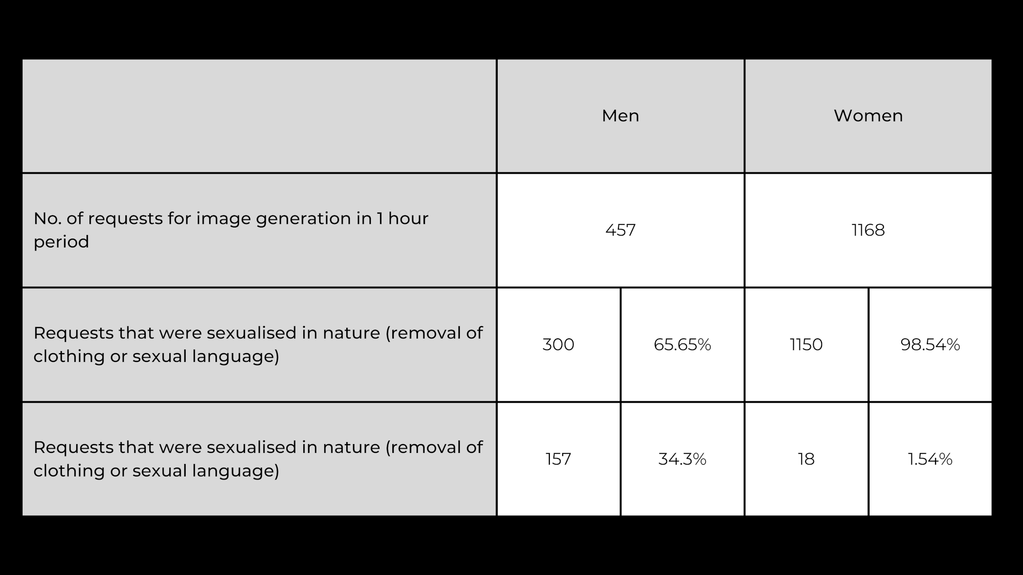 There were identified 457 instances where an image of a man was requested to be edited and 1168 images of women