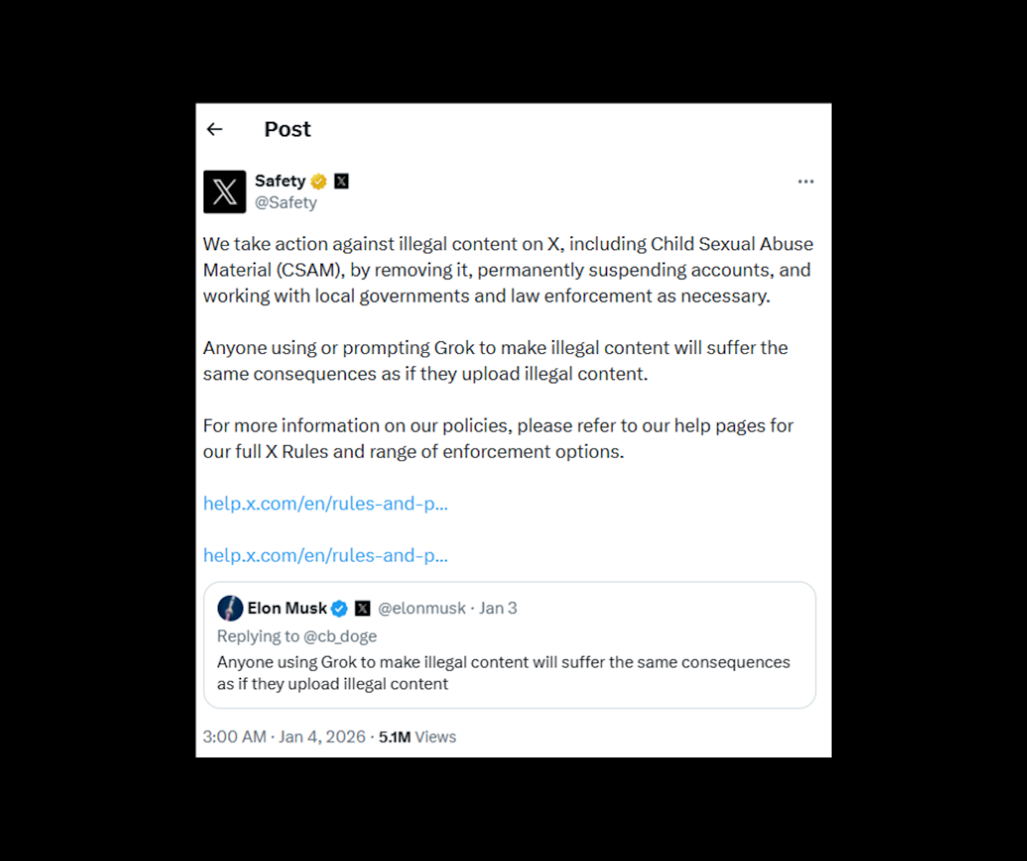 On 9 January, it took CIR analysts just 15 minutes to identify two separate workarounds that users were using to create child sexual abuse material using Grok, as well as another method to avoid post deletion of non-consensual, adult explicit content. These methods were still in use at time of writing, and have been reported by CIR to X.