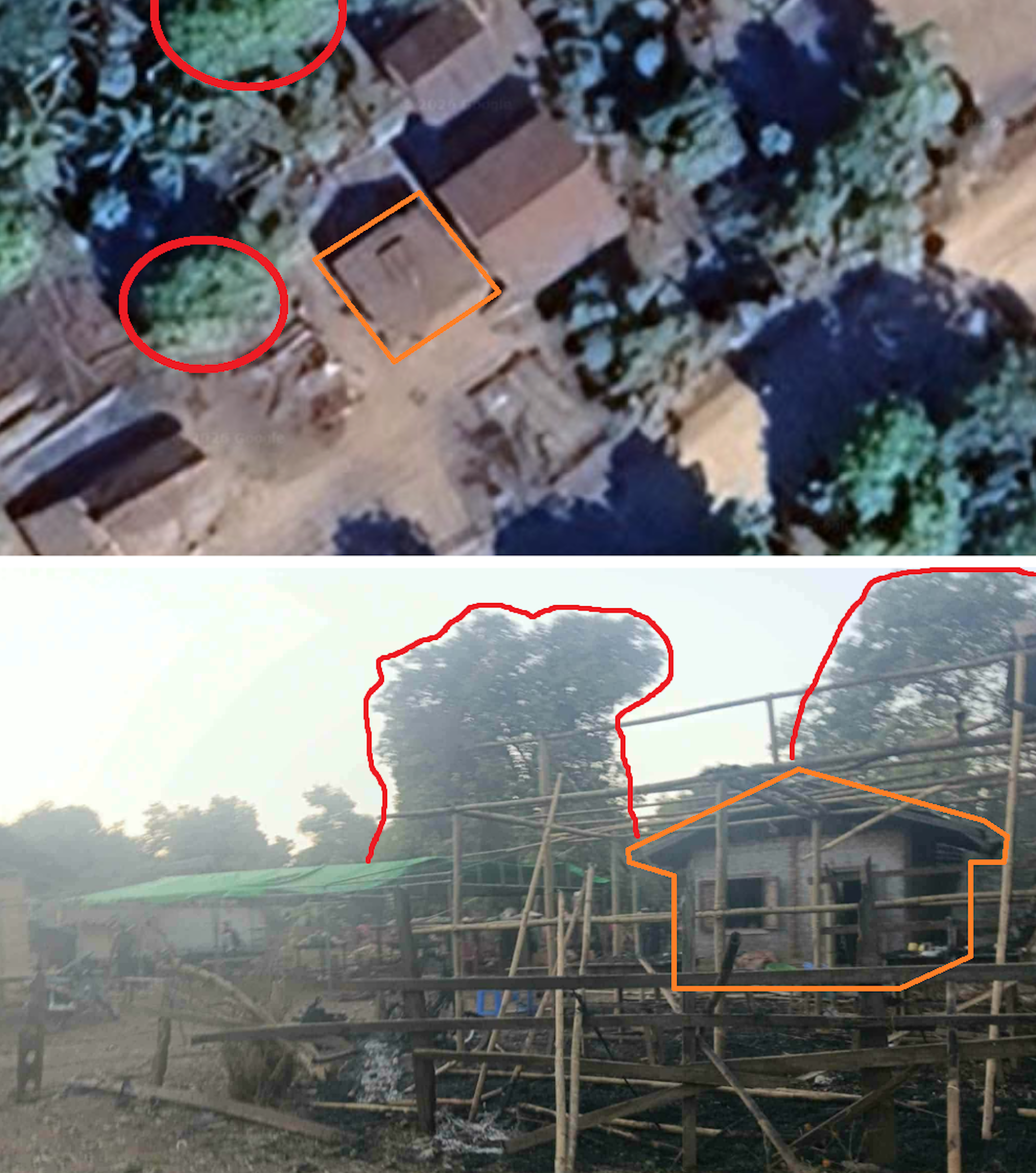 A selection of online imagery (source removed due to graphic content) has been geolocated and chronolocated, verifying the events in Htee Lin village [24.280652, 97.16086]. The verified footage appears to show ten of the reported fatalities, and additional UGC appears to show further casualties with varying injuries at a separate, verified location.