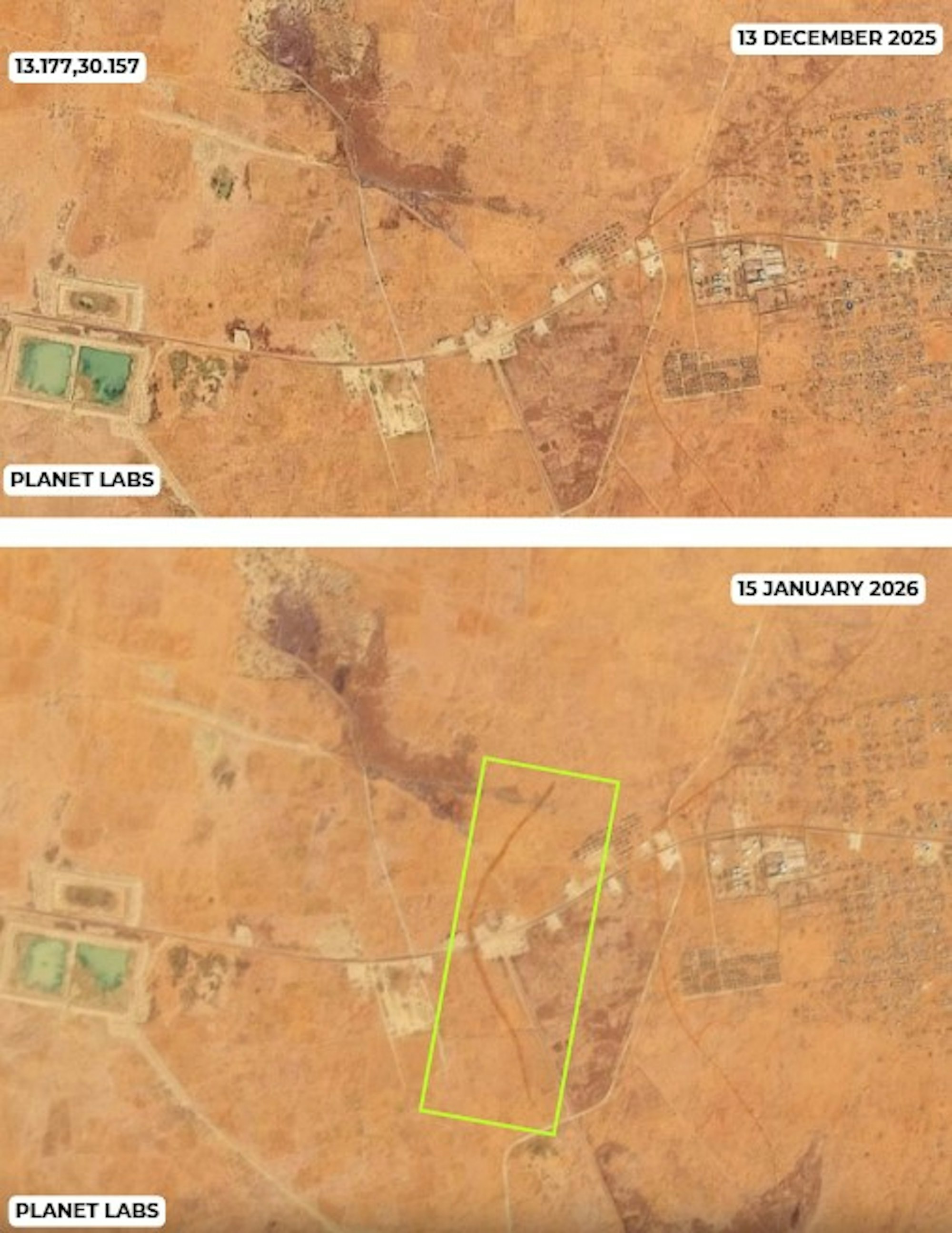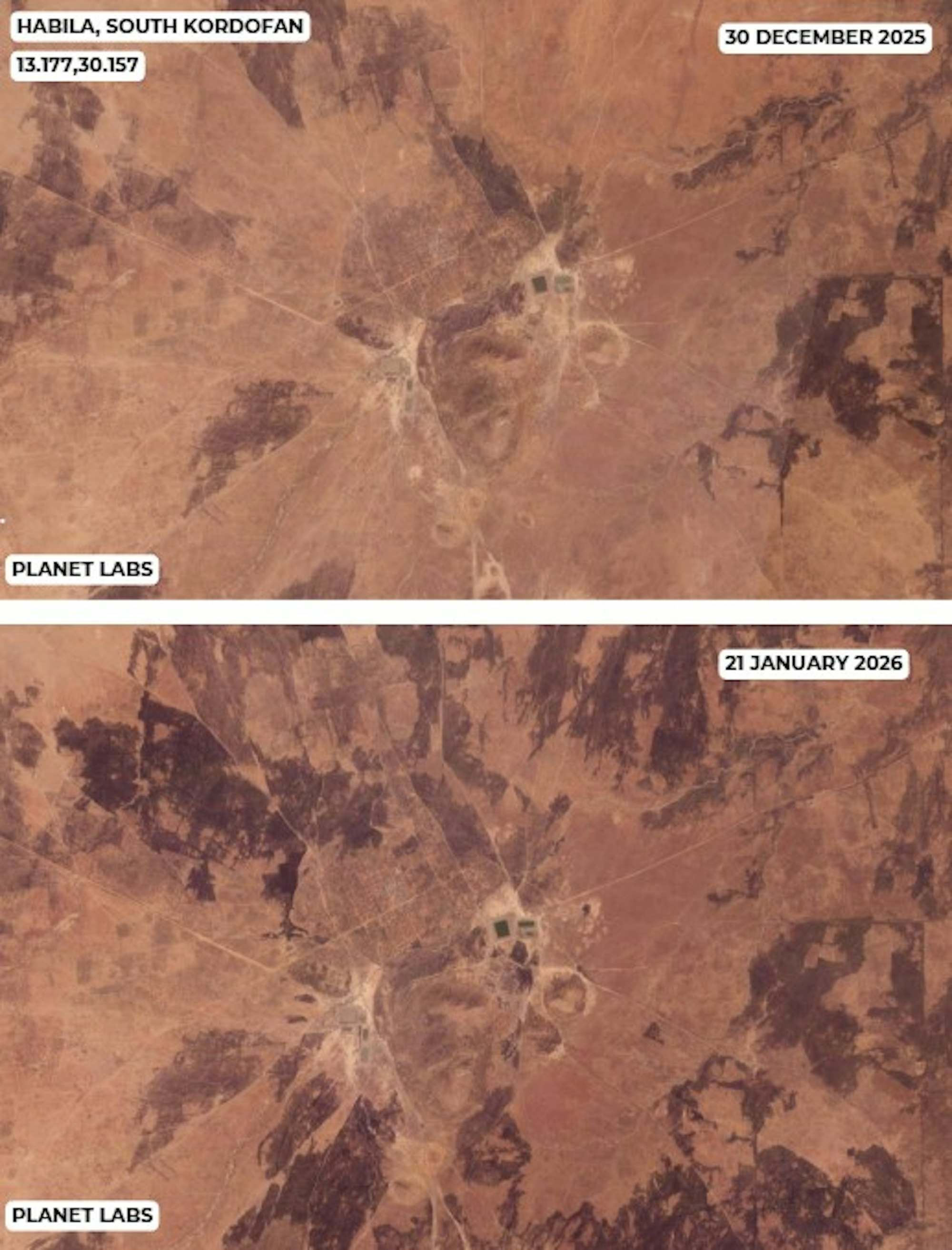 Habila: Planet imagery captured between 30 December 2025 and 21 January 2026 shows burn scars emerging around the settlement (figure 1).