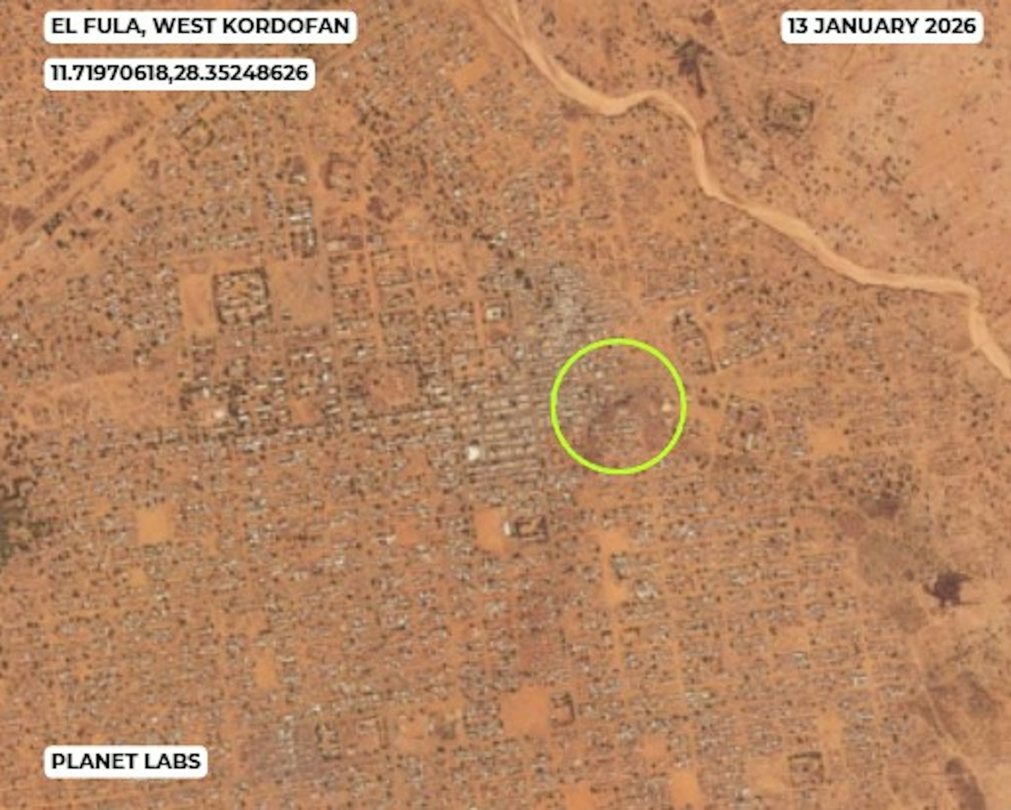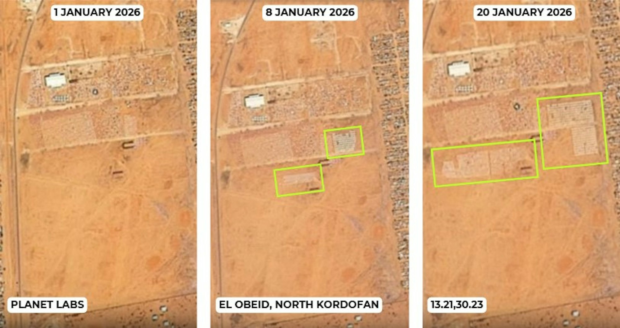 - Satellite imagery indicates the expansion of an internally displaced persons (IDP) camp near El Obeid in North Kordofan, reflecting ongoing displacement linked to the conflict.