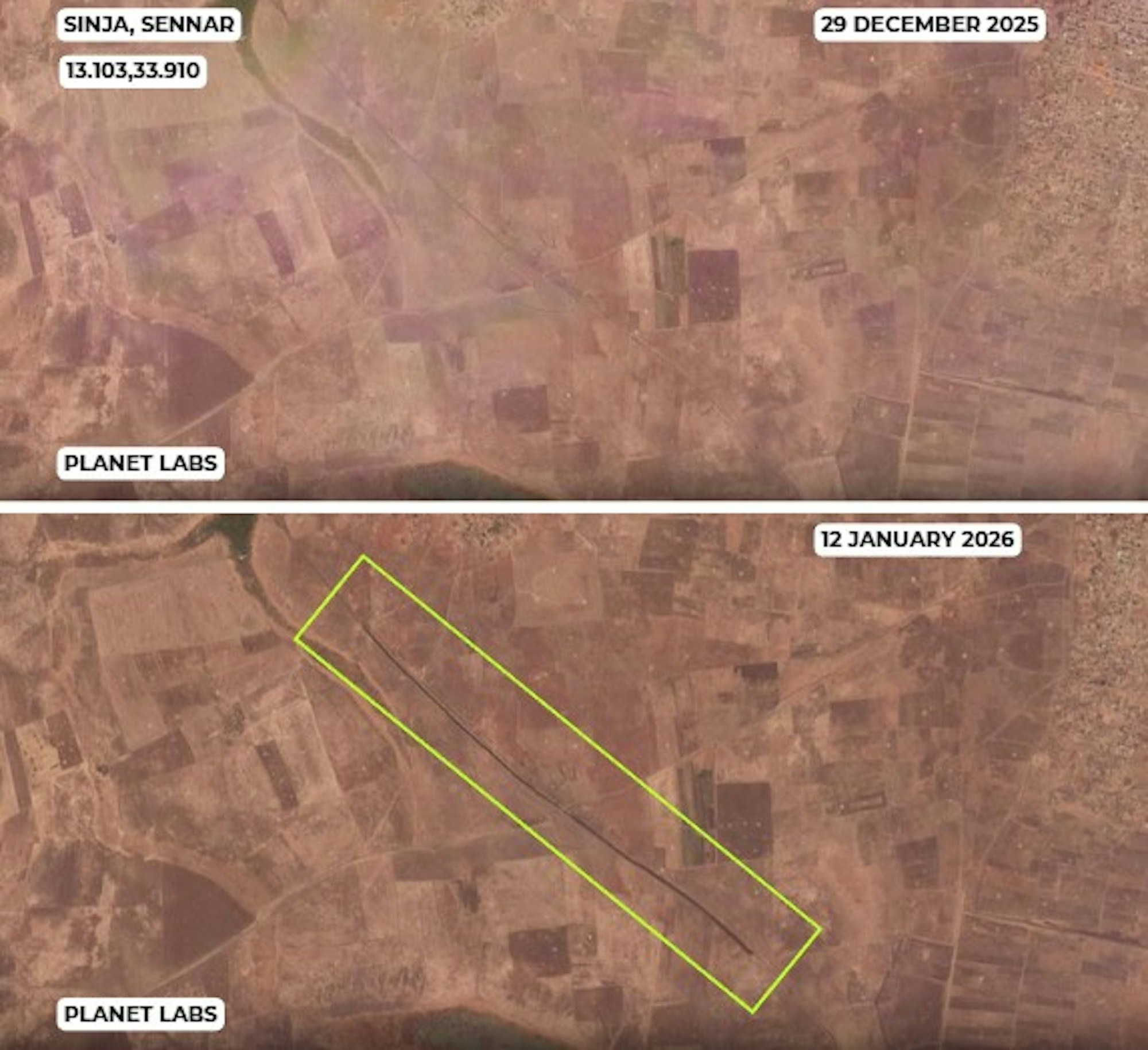 Al Kuweik: CIR verified footage posted on 14 January by a pro-SAF X account, showing SAF soldiers celebrating in central Al Kuweik, located approximately 30 kilometres north of Kadugli, after reportedly repelling an RSF attack. Planet satellite imagery from 13 January shows burn scars appearing around the settlement consistent with those seen after armed clashes.