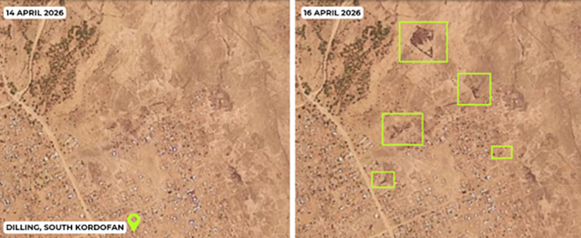 Burn scars consistent with conflict activity appear on Planet satellite imagery across residential neighbourhoods on the western side of Dilling between 1 and 30 March, in the city centre on 14 March, in southern Dilling between 25 and 28 March, and in two further southern areas between 12 and 13 April and 14 and 16 April (figure 2). By 14 April, burn scars also appear in residential areas in northern Dilling.