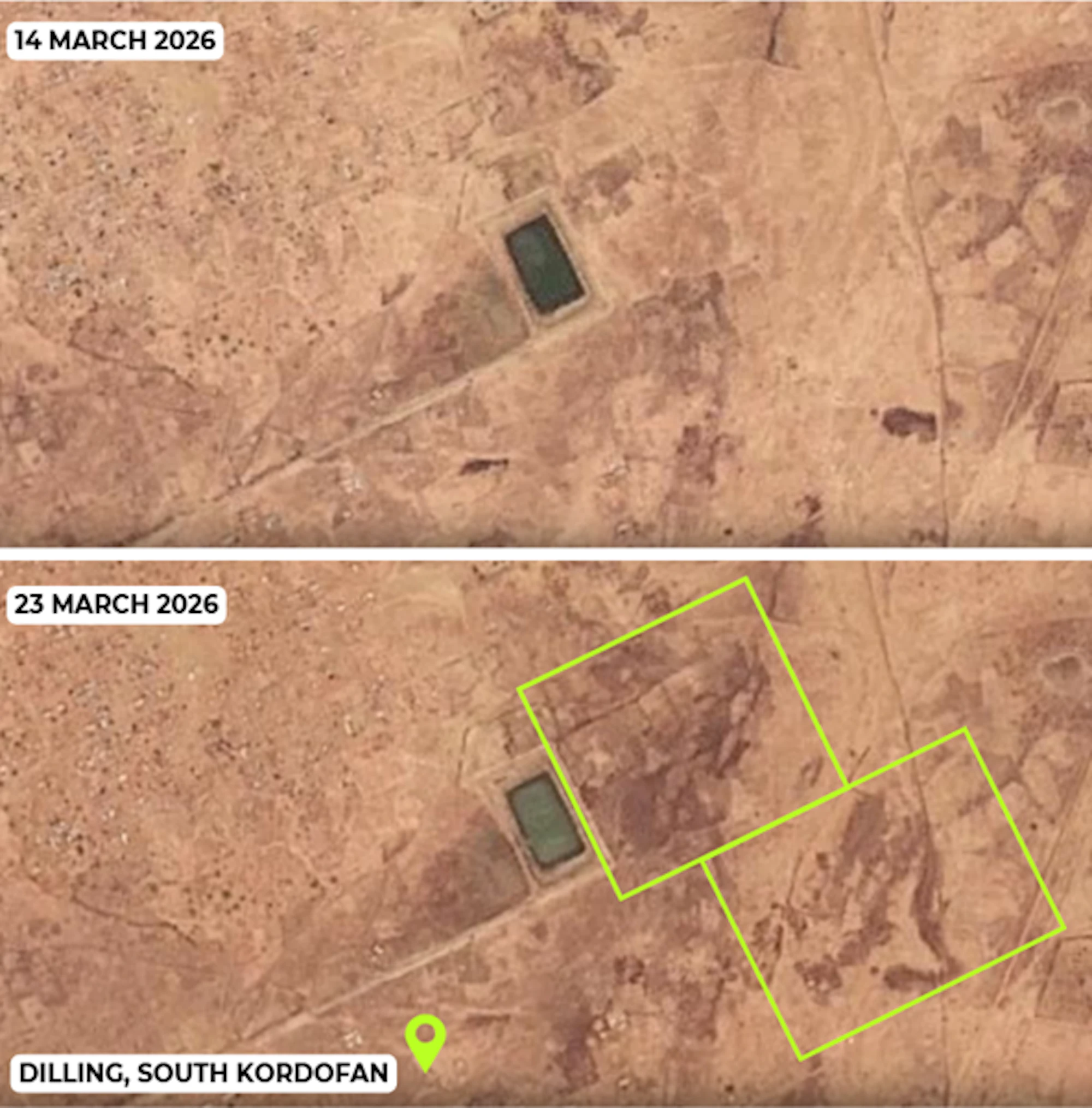 CIR identified burn scars appearing in the vicinity of civilian infrastructure across Dilling between 1 March and 16 April 2026, including residential areas, healthcare facilities, educational institutions, and the city’s primary water supply. CIR is unable to verify the cause of these burn scars, and fires spread easily during this time of the year. However, the changes observed on satellite imagery are consistent with conflict activity seen in other areas of Sudan during the conflict.