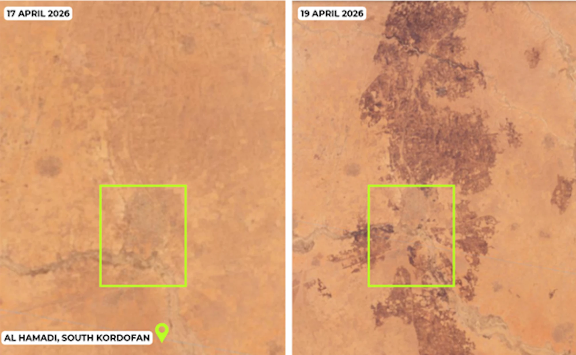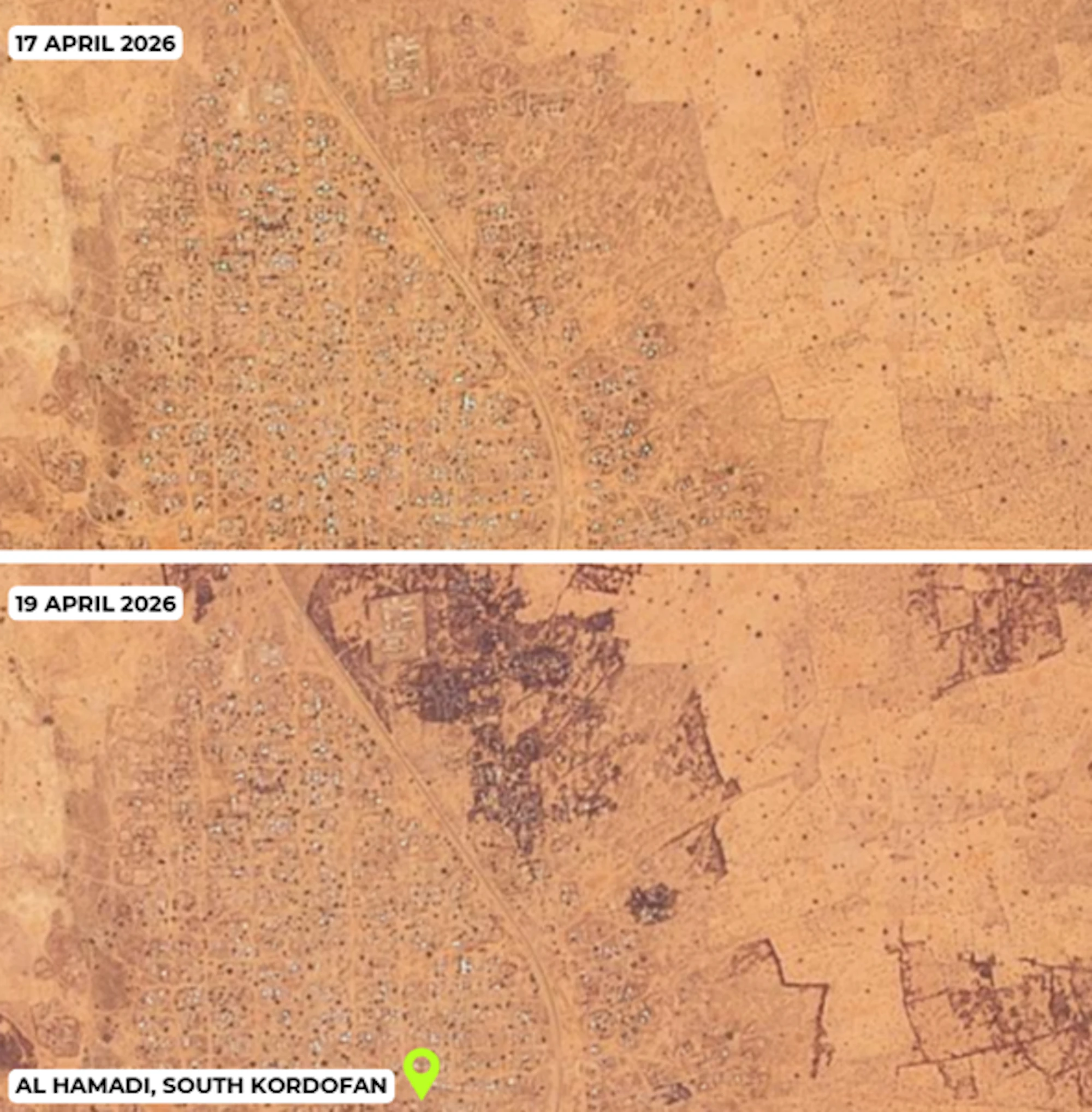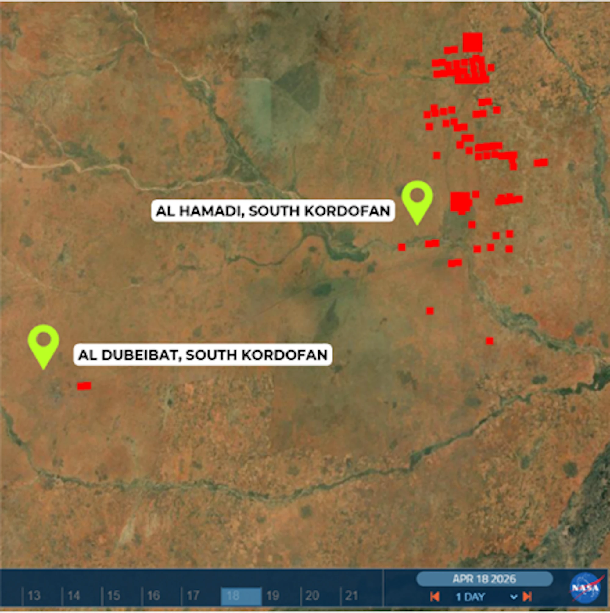 - CIR confirmed large-scale fires across Al Hamadi on 18 April, corroborating reports of armed clashes in the area. NASA FIRMS detected at least 70 heat signatures in and around the city, with Planet satellite imagery from 17 and 19 April confirming burn scars in the vicinity of residential areas — both an indicator and a driver of civilian displacement.