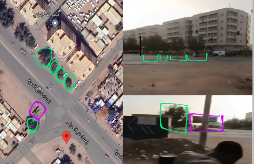The description of the video stated that the area was close to Rumayla roundabout on Al Shajara Avenue. A further comment on social media noted it was Alrowad residential complex. After finding multiple high-rise complexes in the area, CIR investigators locating the billboard seen in the footage and matched the trees and windows in the complex to verify the location (Figure 4).